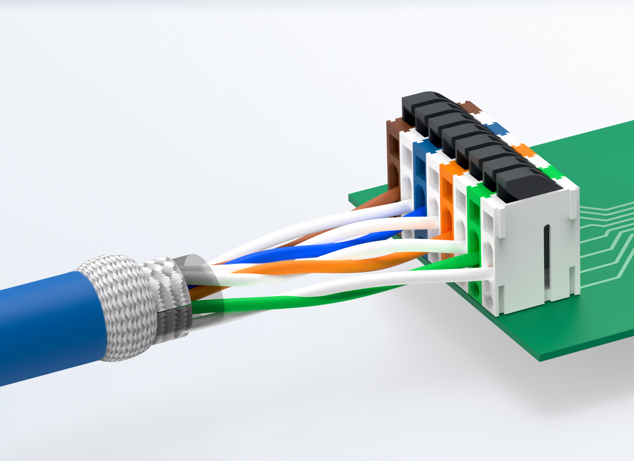 Leiterplatten-Anschlussklemmen sind immer häufiger eine kostengünstige und platzsparende Alternative zu den bisher üblichen RJ45- oder D-kodierten M8- bzw. M12-Steckern, beispielsweise im Schaltschrank, in Steuerungen, in der Sensorik, Bildverarbeitung, Robotik und vielen weiteren industriellen Anwendungen. Das liegt sowohl an den niedrigeren Kosten eines Festanschlusses aufgrund der Bauteilreduktion als auch am montagefreundlichen Anschluss ohne Spezialwerkzeug.