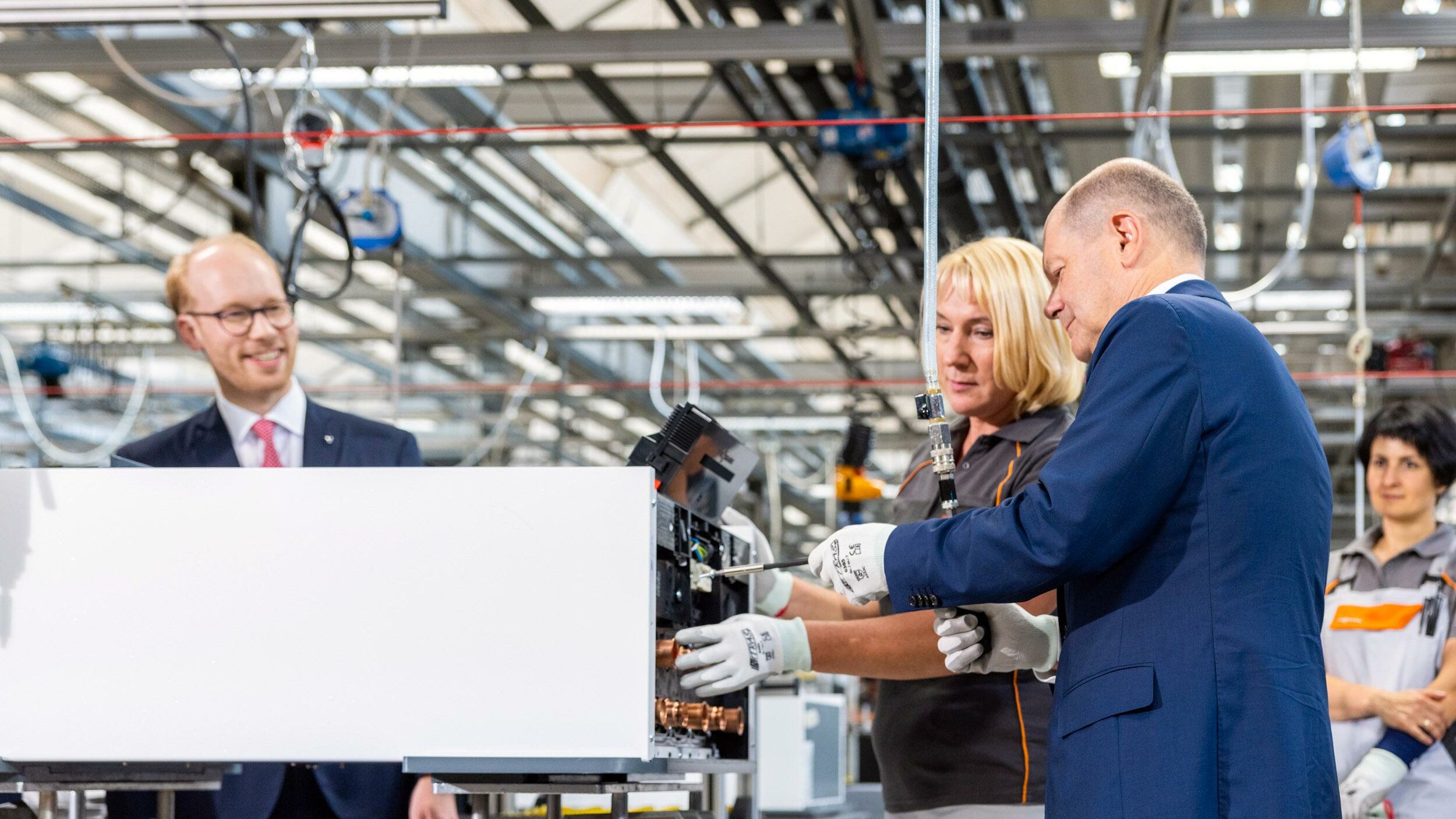 Ganz direkte und praktische Berührung mit der schon heute verfügbaren Zukunftstechnologie Wärmepumpe machte Olaf Scholz bei der anschließenden Führung durch die Fertigung. Mit einem Winkelschrauber setzte der Kanzler zwei Bauteile einer hochinnovativen Wärmepumpe der neuesten Generation zusammen.
