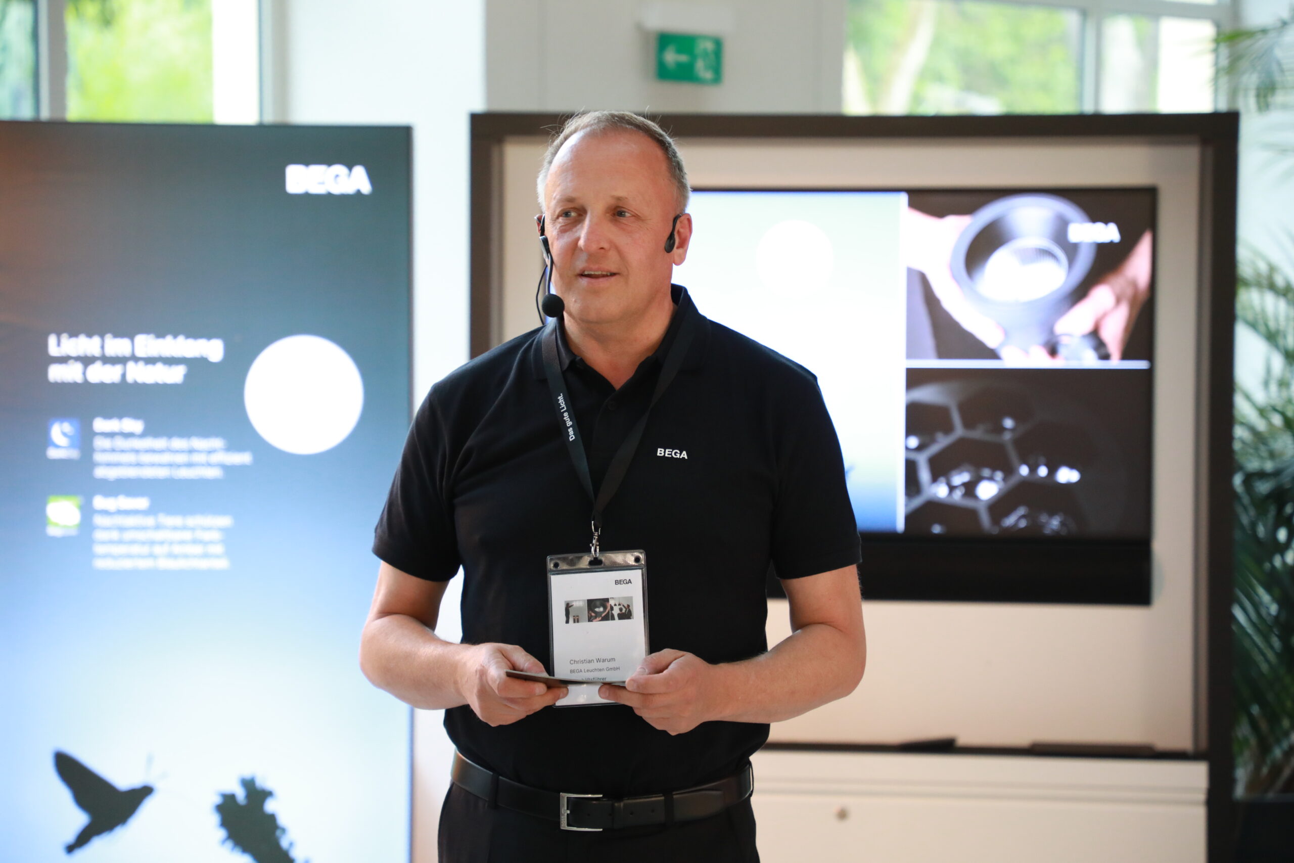 »Licht in Einklang mit der Natur« lautet der Slogan, mit dem Bega die Kunden auf den Einsatz verantwortungsvoller Außenbeleuchtung hinführen möchte – Alexander Cermak (Steiermark, Kärnten, südl. Burgenland) klärte die Gäste auf, worum es geht. (Bild: www.i-magazin.com)