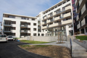 »Betreutes Wohnen« in diesem Wohnbau in St. Pölten – ausgestattet mit einer großzügigen Elektroinstallation. Der Hof wurde bewusst der Hauptstraße abgewendet gestaltet und schützt aufgrund seiner Form vor Straßenlärm. Auch die angrenzende Schule profitiert davon. (Bild: Schneider Electric)
