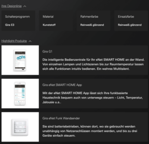 Es folgt die Auswahl der Schalterprogramme samt Design – nach Wunsch (und je nach Designlinie) können Material, Rahmenfarbe sowie Einsatzfarbe angepasst werden. Und das war es dann tatsächlich auch schon mit der Konfiguration!