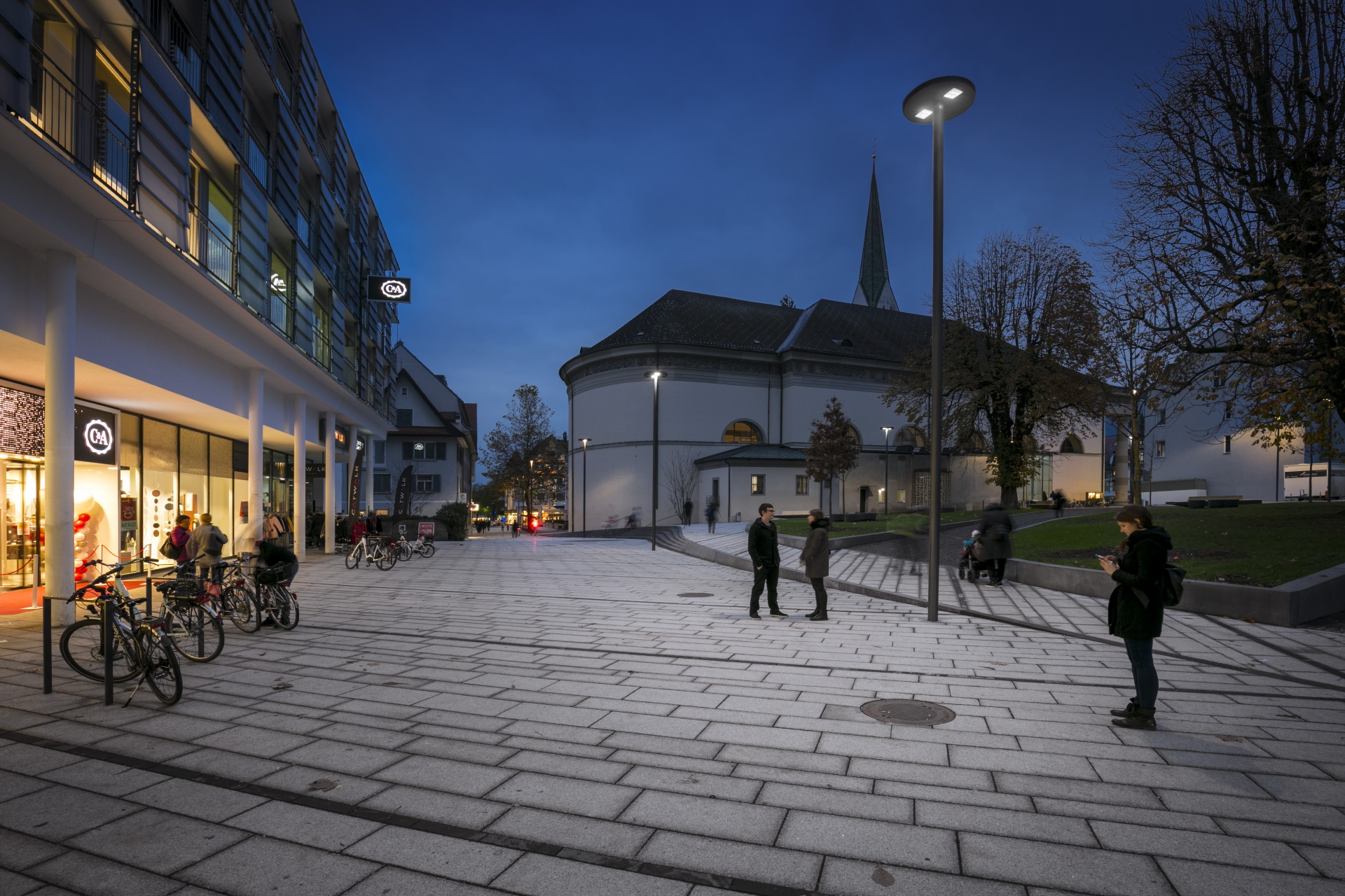 Die erweiterte Fußgängerzone verbindet den Marktplatz, den aufgewerteten Kirchenpark und die Schulgasse. Das Ziel war, die Attraktivität von Dornbirn als beliebteste Einkaufsstadt in der Region Vorarlberg zu steigern. Die Vorgabe der Landschaftsarchitekten und Stadtplaner von großen runden Leuchten auf Masten wurde mit projektspezifisch angepassten Civiteq LED-Lichtmodulen von Thorn umgesetzt. Mit einem Durchmesser von einem Meter und einer Höhe von nur 12 Zentimetern fügen sie sich in unterschiedlichen Montagehöhen harmonisch in das Stadtbild und den Park ein. Die spezifische Oberflächenfarbe der Leuchten entspricht den anderen metallischen Elementen im neu geschaffenen urbanen Raum.
