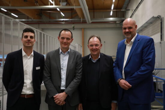 V.l.n.r.: Mario Nieder – Standortleiter Weißkirchen, Guillaume Texier – CEO der internationalen Rexel-Gruppe, Robert Pfarrwaller – CEO von Rexel Austria und Stefan Huemer – Supply Chain Director (Bild: www.i-magazin.com)