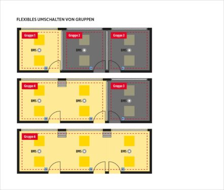 Durch ein flexibles Umschalten von Gruppen lassen sich Funktionen und Parameter flexibel an eine wechselnde Raumnutzung anpassen. Je nach Situation wird dafür ein anderes Szenario aktiviert: Per Schalter, zeitabhängig – oder, wie hier, mit einer mobilen Trennwand. (Bild: Esylux GmbH)