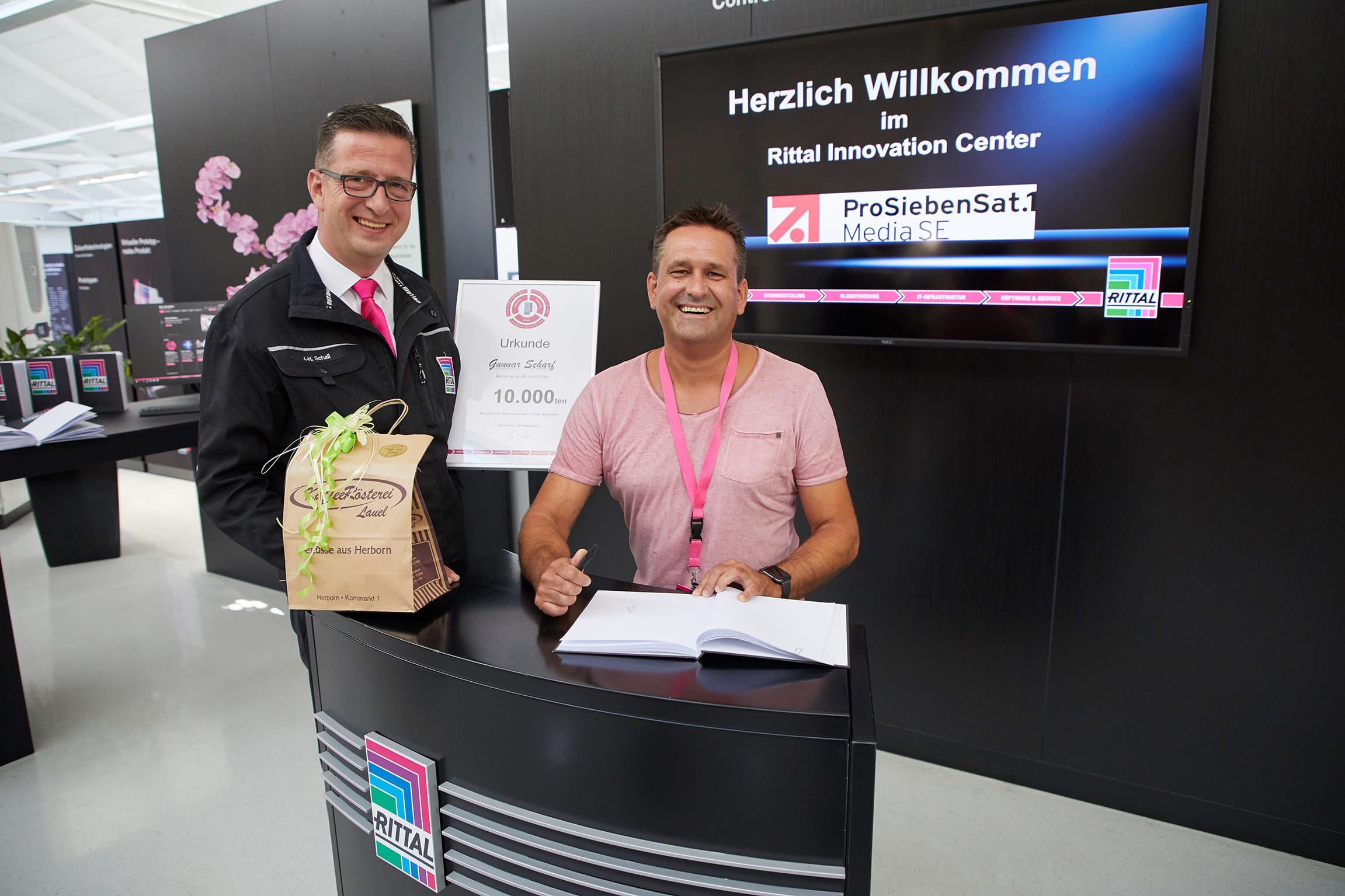 Eine große Überraschung gab es am 4. Juli für eine Besuchergruppe von ProSiebenSat1 Media SE. Gunnar Scharf, Teilnehmer der Gruppe, war der zehntausendste Besucher des Rittal Innovation Center. Der IT-Experte erhielt von Jan-Henry Schall eine Urkunde sowie ein Geschenk überreicht. „Als zehntausendster Besucher war es mir eine Ehre, das Rittal Innovation Center besuchen zu dürfen. Die Firma Rittal hat den Industrie-Plan 4.0 als Basis für Ihre Kunden voll verstanden“, schrieb Gunnar Scharf ins Gästebuch. Weitere Einträge der Besucher in den Gästebüchern dokumentieren die Besonderheit des Innovations- und Trainingszentrums. So hielt eine afrikanische Besuchergruppe fest: „Hier haben wir die Antwort gefunden, nach der wir gesucht haben. Vielen Dank“. Und eine deutsche Gruppe fasste ihren Besuch wie folgt zusammen: „Die Einkaufsliste wurde immer länger. Sehr interessante Anwendungen.“