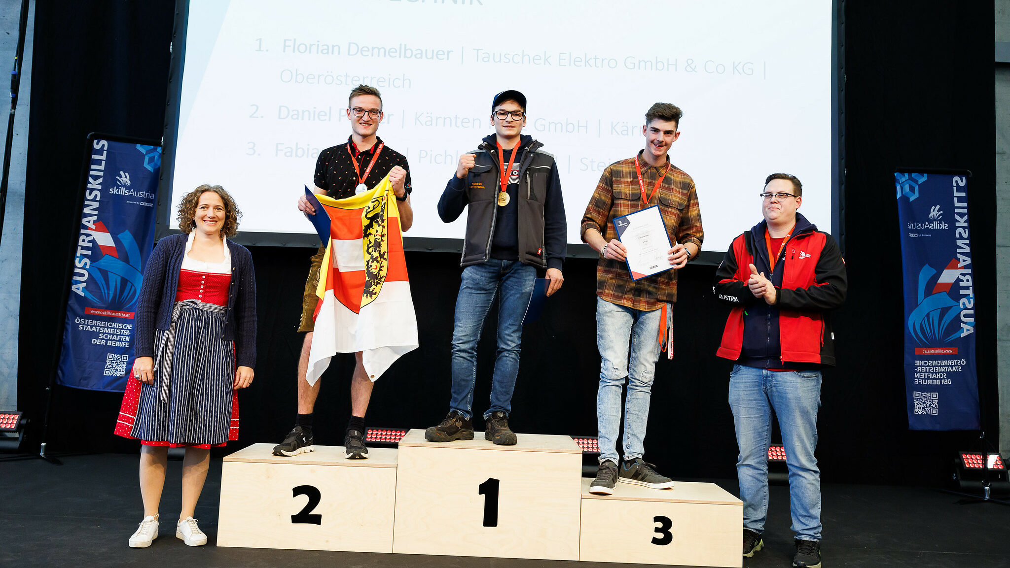 Gleich 15 Mal darf Tirol bei den AustrianSkills 2023 jubeln: Für Titel sorgen in Salzburg die Teilnehmenden in den Berufen Chemielabortechnik und Gartengestaltung. Außerdem darf sich das Bundesland über den ersten Platz in der Speditionslogistik freuen. Sechs Mal geht der Vizestaatsmeistertitel nach Tirol, sechs Mal Bronze. Die niederösterreichischen Teilnehmenden sorgen für drei Staatsmeistertitel (in der Paradedisziplin Betonbau, bei den Floristinnen und Floristen sowie in der Tischlerei), vier Silber- und sieben Bronzemedaillen.