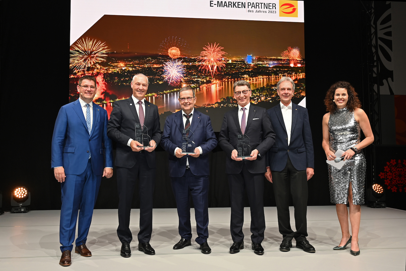 Die E-Markenpartner-Preis-Gewinner 2023: Thomas Sell, Vorstand Vertrieb Theben AG (2. v. l.), Bruno Reufels, Vorsitzender der Geschäftsführung der Niedax Group (3. v. l.) und Ulrich Leitermann, Vorsitzender der Vorstände der SIGNAL IDUNA Gruppe (3. v. r.) mit ZVEH-Präsident Stefan Ehinger (l.), ZVEH-Vizepräsident Hans Auracher (2. v. r.) und Moderatorin Katie Gallus (r.). (Bild: ZVEH)