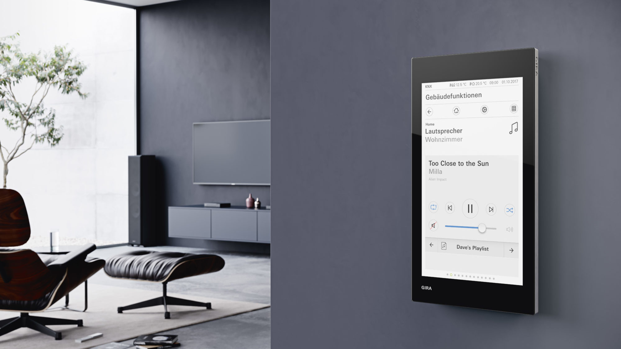Neu ist auch die Funktion Audio-Steuerung: Mit dem Gira G1 können ab sofort alle Audiosysteme mit KNX Schnittstelle gesteuert werden. So lassen sich die Musik starten und unterbrechen, Lautstärken regulieren, das System stummschalten, zwischen Titeln wechseln und Infos zu aktuellen Songs einsehen.